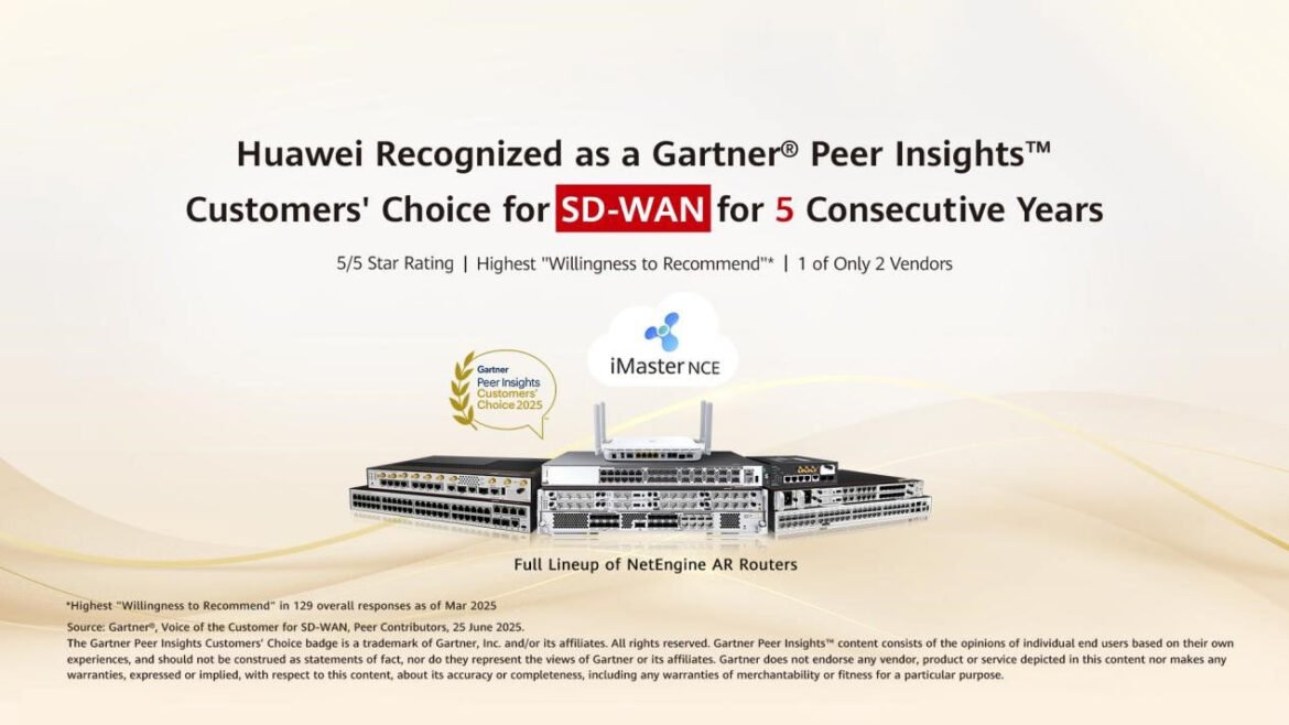 Shenzhen, China. Huawei ha sido reconocida por quinta vez consecutiva con el prestigioso galardón ‘Customers’ Choice’ otorgado por Gartner Peer Insights, gracias a su innovadora solución de red de área amplia definida por software (SD-WAN). Este reconocimiento refleja la alta satisfacción y confianza de los clientes globales en la tecnología de Huawei.