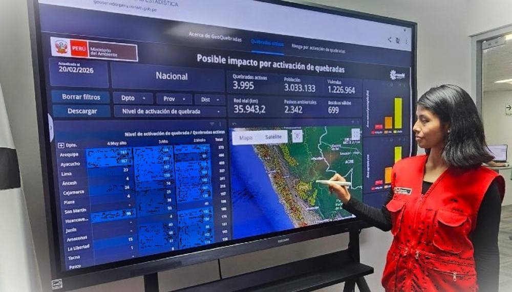 Ante la temporada de lluvias, el Ministerio del Ambiente (Minam) pone a disposición de autoridades regionales y municipales, así como de la ciudadanía, la plataforma digital “Geoquebradas”, una herramienta que permite identificar la posible activación de quebradas ante precipitaciones intensas y estimar su impacto sobre la población, viviendas, instituciones educativas, establecimientos de salud, carreteras, pasivos ambientales y botaderos.