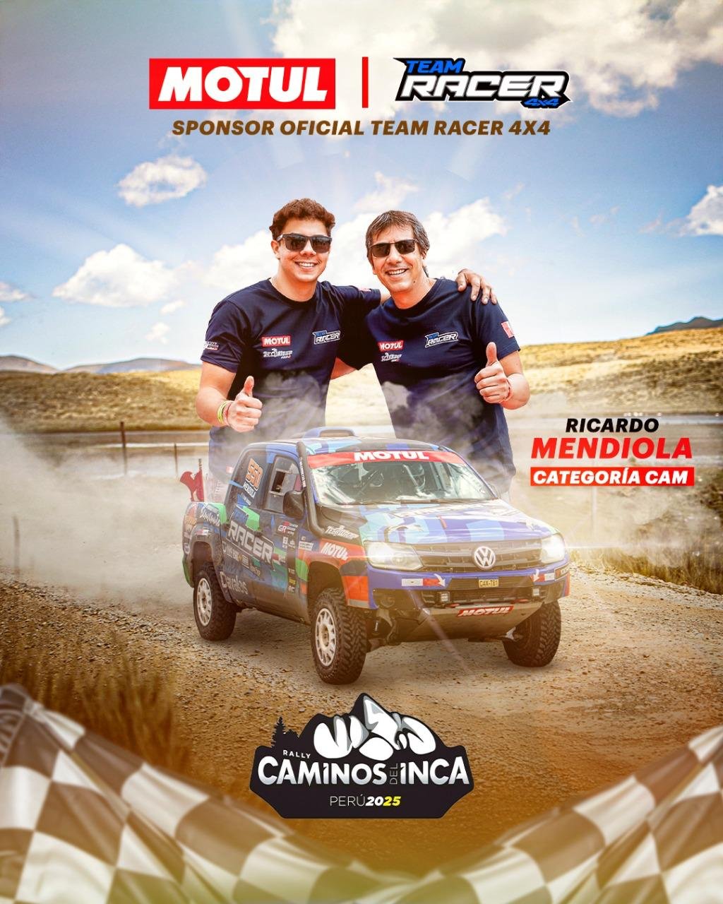 En la categoría CAM (camionetas), el binomio padre-hijo Ricardo y Gonzalo Mendiola (N° 550) vuelve a escena. Con un historial que incluye el título de Campeones Nacionales de Rally CAM 2022, el Campeonato ACP 2022 y 2023, y el 3er puesto en Caminos del Inca 2024, la dupla vuelve a apostar por Motul para afrontar las exigentes rutas del rally más importante del país.